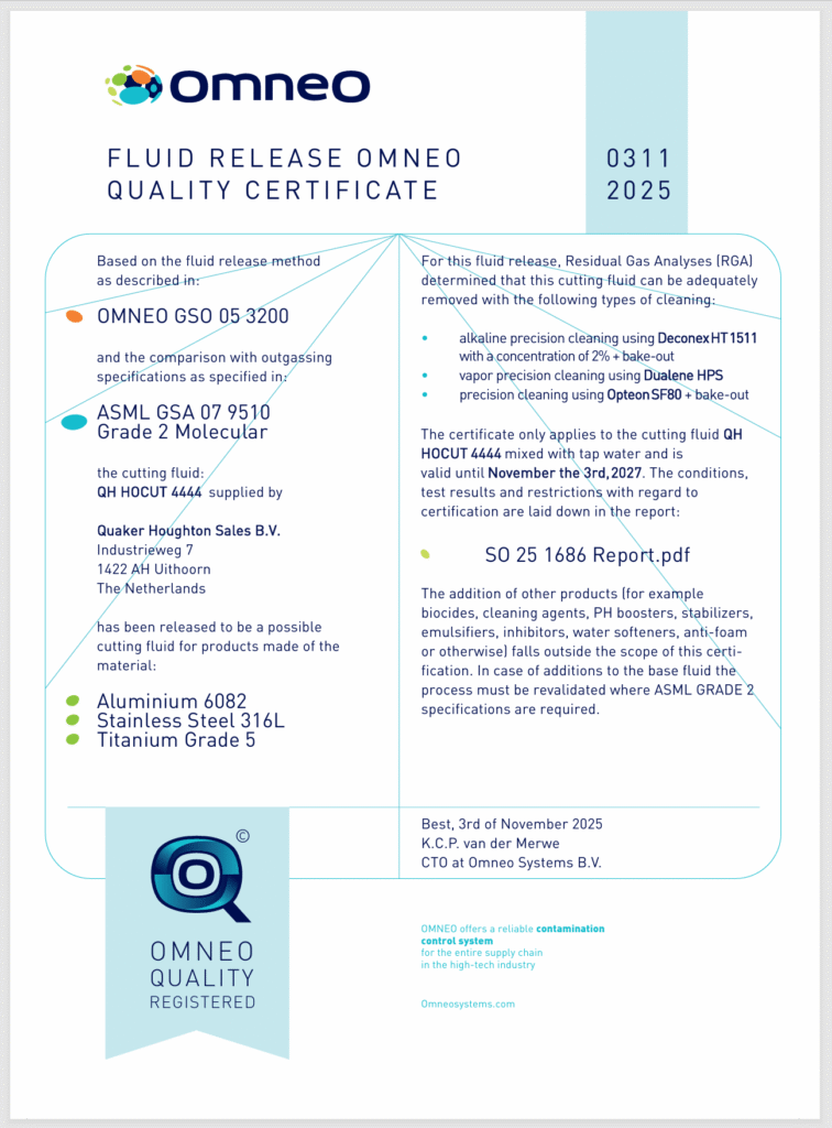 Quaker Houghton Hocut 4444 is november 2025 ge(her)certificeerd voor het verspanen van aluminium, roestvrij staal en titanium.